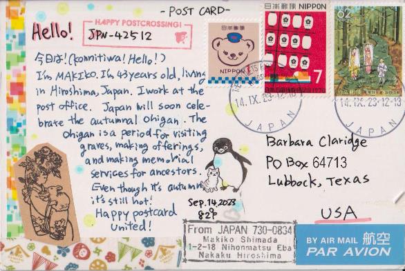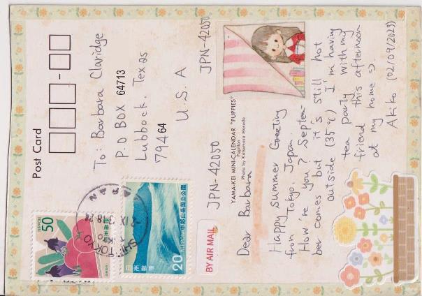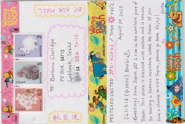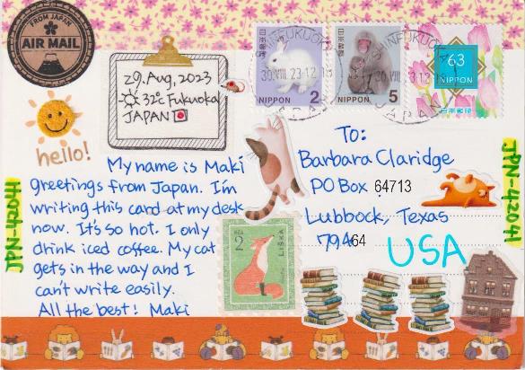 Where to buy stampsUSPS - United States Postal Service is the place to buy stamps. If you order them from their website they will mail them direct to your mailbox (no charge for shipping!). You can pay by credit card or PayPal. Alternatively you can just go to the post office, wait in line and purchase stamps there.The current postage for mailing postcards (not in an envelope) as of August 2023 is: Domestic (USA to USA) $0.51 cents International (everywhere outside of USA)$1.50 Where to buy postcardsAmazon is a good source, in addition to your local stationary stores, card shops, museums and hotels. Travel stops like Love's usually have a postcard rack with local themes. Sometimes you can find them in drugstores, they still have a few at my local CVS. (The last time I went looking in my local Walgreens and Walmart, they had stopped selling postcards). Etsy and Ebay are some other online places to get mixed lots of new and vintage postcards.Postcard Swapping Sites (free to use) and Letter Writing Clubs (pay to join)Postcrossing is the original postcard swapping site, with loads of resources and a very active forum. As soon as you request to Send a Postcard, you will receive a random member address and a Postcard ID. You are then expected to snail-mail a postcard to that member. When the recipient receives your postcard and registers it, your address will go in the pool and you will receive a postcard from another random member. Initially, you can have up to 5 postcards traveling simultaneously. As time goes on, the number of postcards that you can send and receive will increase.Postcard United is another great postcard swapping site, this one starts you out with up to up to 7 postcards traveling simultaneously. This site is a bit more rudimentary than postcrossing, and it does not have a forum or any active support, so it's better if you are already an experienced postcard swapper. However, because your card limit increases exponentially, you will receive many more postcards from Postcard United members. For example, since 2021 I've sent 74 postcards and received 101 postcards, and I can have up to 30 travelling simultaneously. (Compare to Postcrossing, since 2021 I've sent 38, Received 37 and am only allowed to have 9 travelling simultaneously). Geopostcards Club Another nice but small postcard swapping site. This one starts you out with 3 postcards. This site has a slew of sister sites for other types of swapping that I've also participated in such as papermoney swaps (good if you already have foreign paper money you'd like to trade), sticker swaps and stamp swapping. The Letter Exchange is a subscription-based service (about $23 per year). They will send you a lovely printed and staple-bound booklet that lets you find snail-mail pen pals through listings posted by people like you. The booklets are interesting reading by themselves, even if you don't decide to participate. The listings are mostly for letter writing but there is a section for people interested in Postcard swaps. Bonus: There are people who want to exchange letters written in Fountain Pens here! The booklets are sent to you 3 times a year, with an Autumn, Winter and Summer edition, each is about 30 pages long. They are jam-packed with letter-writing history, interesting articles, nostalgic images and illustrations and much, much more. Letter Writing and Postal Related SitesWriteALetter.org A lovely and interesting blog by a retired postal carrier.The Letter Writers Alliance is an archive with free downloads, recorded events, and blog posts (it was previously an active member-based organization dedicated to keeping letter writing alive). Postal News - Daily news digest from the postal world! Send Me a Postcard! If you include your mailing address on the card I will send you one in return. Barbara Ann Claridge PO Box 64713 Lubbock, TX 79464 USA I will be happy with ANY postcard you send me, but if you want ideas, here are some things I love: